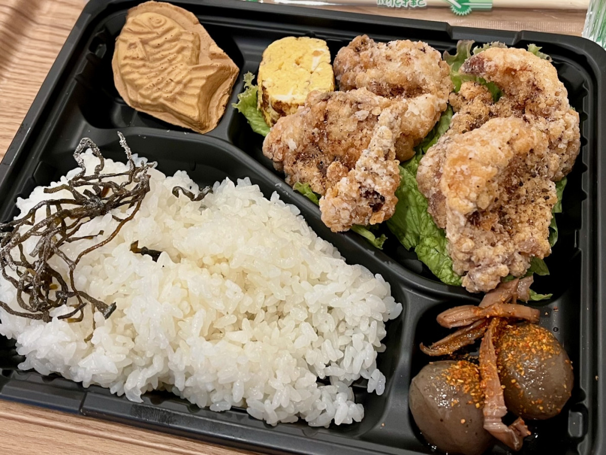 メニューは「からあげ弁当」と「牛丼」(以上880円)の2種類。からあげ弁当は、塩こうじ、ニンニク、ショウガに加え、焼酎で漬け込んだ鶏肉を使った唐揚げや、だし巻き卵、あたりめで煮込んだコンニャク、鳥羽・桃取産ワカメを使ったスープ、小さな粒あんたい焼きを添える。牛丼は国産牛を使う。
