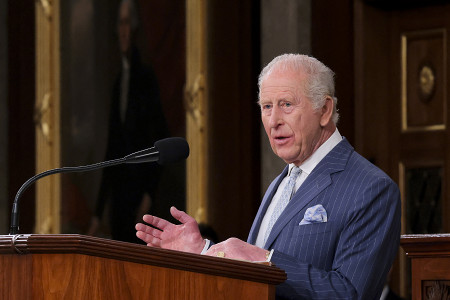 28日、ワシントンの米議会で演説するチャールズ英国王。「われわれの同盟が共通の価値観を守り続けることを心より願っている」と述べ、亀裂が深まる米英関係の修復を呼び掛けた。 【AFP時事】