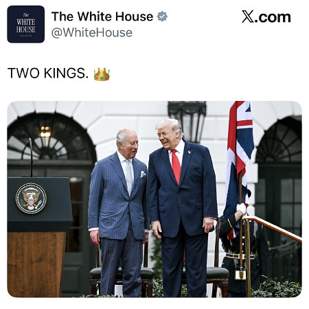 米ホワイトハウスは28日、トランプ大統領が訪米中のチャールズ英国王を迎えた際の写真をX(旧ツイッター)の公式アカウントに掲載し、「2人の国王」という説明を付けた。 【時事通信社】