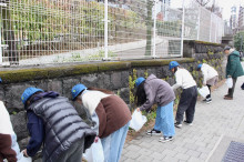 赤坂通りのごみを見つけて拾う赤坂小の児童
