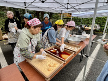 つきたての餅をきな粉やしょうゆで仕上げる様子
