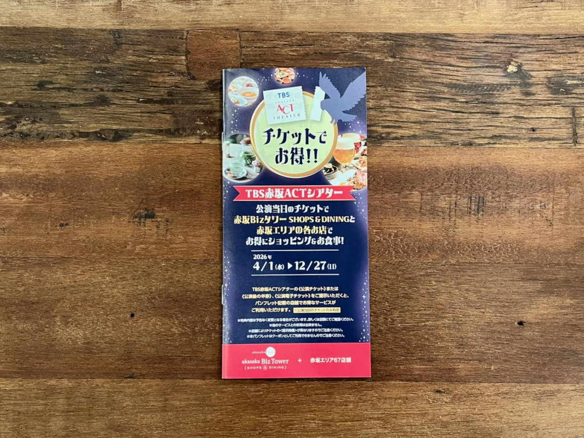 赤坂エリアの飲食店など94店を紹介する、TBS赤坂ACTシアターの観劇客向けパンフレットが4月1日に発行された。