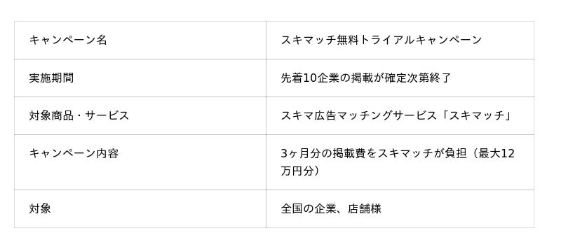 本キャンペーンは、スキマッチの広告体験をより多くの企業に知っていただくための取り組みです。
