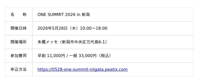 一般社団法人ローカル・スタートアップ協会(所在地:東京都千代田区、代表理事:斎藤潤一)は、食と地域、農林水産業の未来を公民連携で議論するカンファレンス「ONE SUMMIT 2026 in 新潟」を、2026年5月28日(木)新潟市・朱鷺メッセで開催します。
