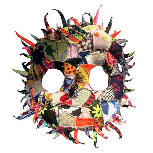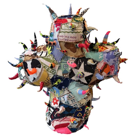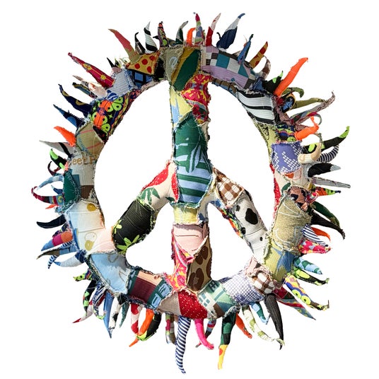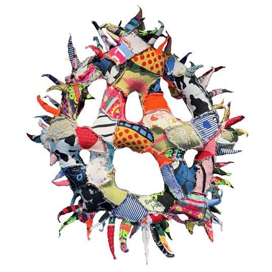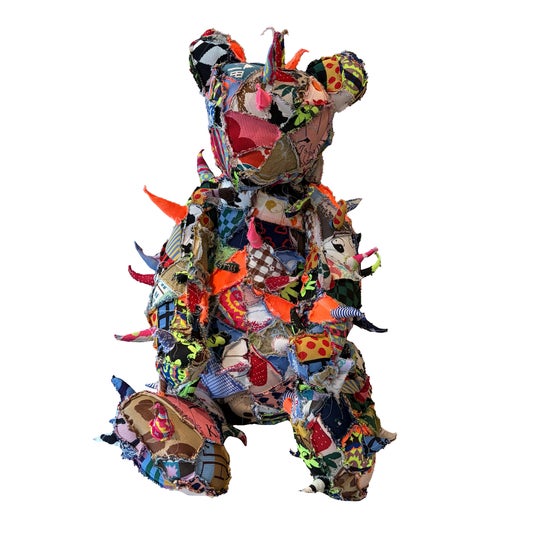 作品はクッションをイメージしており、家のインテリアとしても楽しめるデザイン。全身トゲトゲのパンクベア、十字架、ピースマーク、アナーキーマーク、グルグルマーク、陰陽マーク、第3の目が開いたスマイルマークなどのぬいぐるみたち。