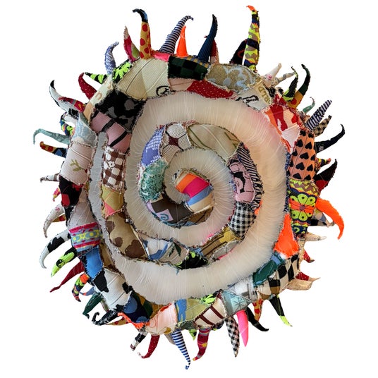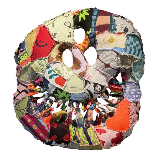 今回のインスタレーションは、生産・販売の過程で傷や汚れが付いてしまったKNT365の過去の作品をアップサイクルとして、一度全て細かく切り刻みそれをパッチワークで縫いつなぎKNT365のアーカイブ(歴史)柄を作り、再構築して制作しています。