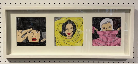 今回の展示では、AZUSA IIDA初となる色鉛筆で描いた額装作品を発表。KNT365とのコラボレーションのために書き下ろした3点を1セットにした特別仕様で、額装の色合いも空間をイメージして仕立てられています。