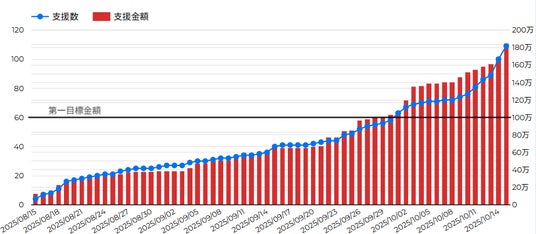 ▼支援募集期間を通じた支援数(折れ線)、及び支援金額(棒線)