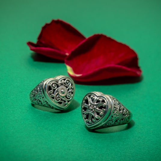 GEROCHRISTOギリシャの名門ジュエラー「GEROCHRISTO(ジェロクリスト)」が手がけた、2種類のハートモチーフリング。地中海の光と風を思わせる透かし模様の奥に、永遠に輝く“愛”への祈りを秘めたデザインです。重厚なシルバーに繊細な細工を施したリングは、“愛すること”の強さと美しさを静かに語りかけます。