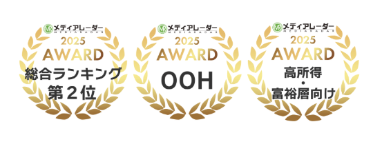 「メディアレーダー2025AWARD」とは、株式会社アイズが運営する広告・マーケティング資料のポータルサイトである「メディアレーダー」にて、2025年度に人気を集めた広告媒体資料を表彰するアワードです。当社は本アワードにて、総合ランキング2位、OOH(屋外広告)部門1位、高所得・富裕層向け部門1位を受賞いたしました。