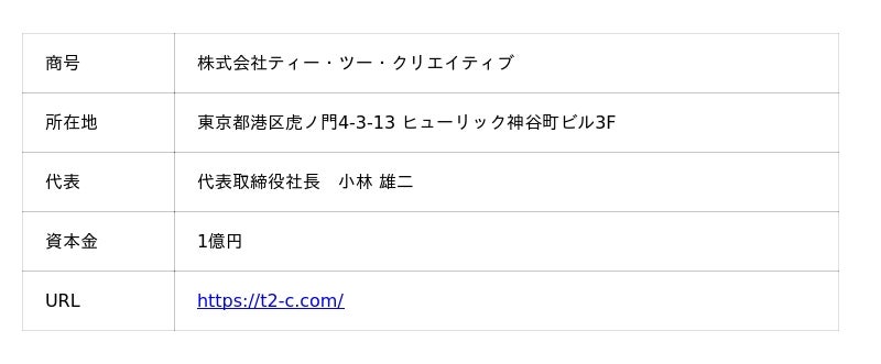 リリース発行企業:株式会社ティー・ツー・クリエイティブ