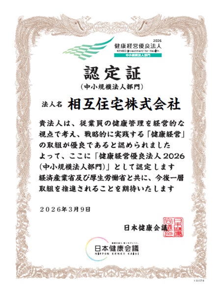 第一ライフ丸紅リアルエステート傘下の相互住宅株式会社(本社:東京都品川区、代表:武富正夫)は、2026年3月9日付で「健康経営優良法人2026(中小規模法人部門)」に認定されました。