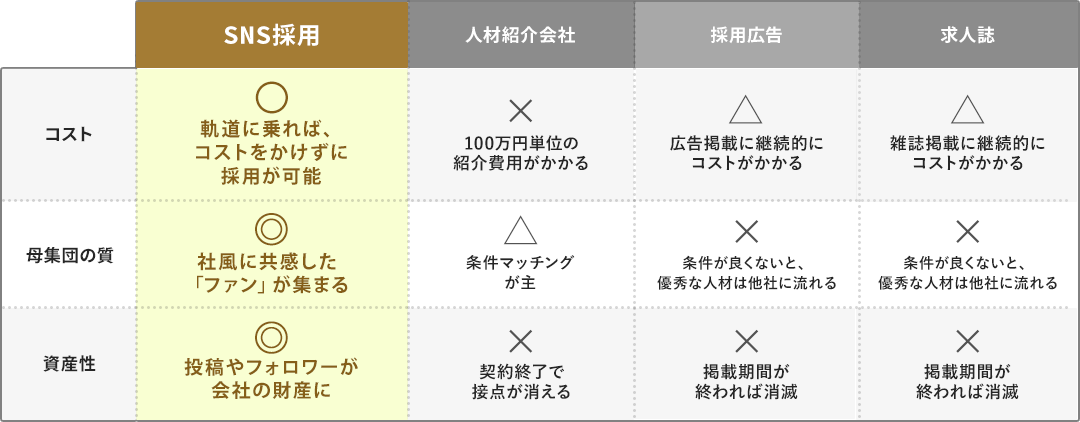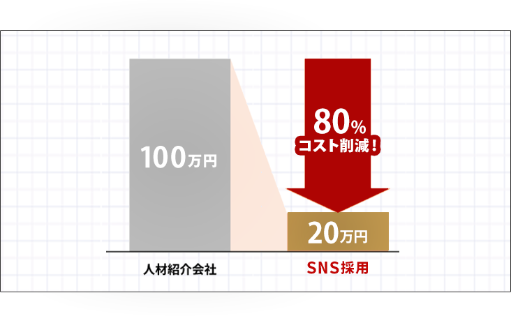 SNS採用は、従来の採用手法に比べて圧倒的にコストパフォーマンスに優れています。