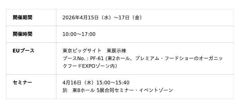 会期中、EUは「EUオーガニックが描く食の未来 ― 日本で考えるサステナブルな食の可能性 ―」をテーマに「プレミアム・フードショー 2026」の特別セミナープログラムに参加いたします。セミナーは4月16日(木)15時より東京ビッグサイト東8ホール5展合同セミナー・イベントゾーンにて行われます。SDGsや農林水産省のみどりの食料システム戦略を背景に、日本国内でもオーガニック市場への関心が高まっておりますが、本セミナーではオーガニック分野では先進地域であるEUの市場動向、認証制度や実践的な取り組みを紹介します。あわせて、消費者意識が「健康・安全」から「環境・倫理」へとシフトする潮流を踏まえ、日本市場におけるサステナブルな食品展開の可能性について考察し、企業が今後も選ばれ続けるためのヒントを提示します。