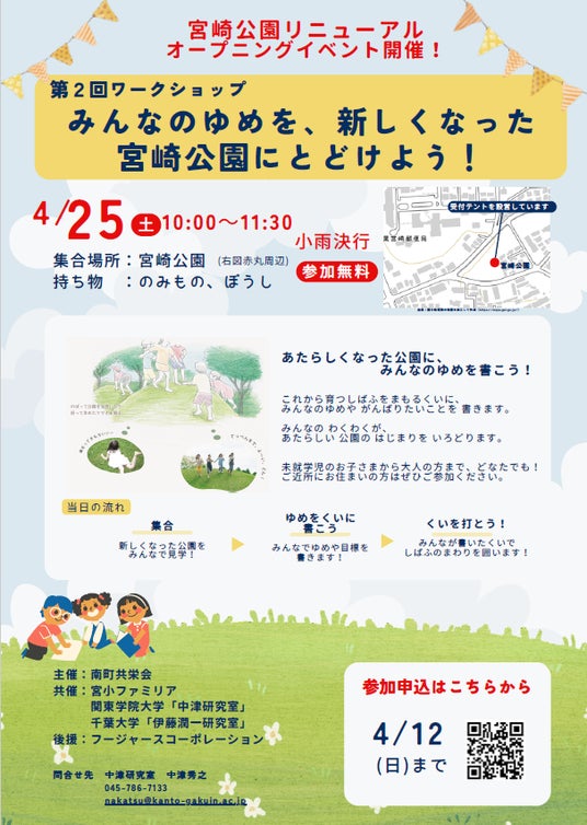 株式会社フージャースコーポレーション(本社:東京都千代田区、代表取締役社長:小川栄一)、及び千葉市中央区南町共栄会、宮小ファミリア、関東学院大学(中津研究室)、千葉大学(伊藤潤一研究室)は、千葉市中央区の宮崎公園(千葉市中央区宮崎1丁目)においてリニューアルオープンオープニングイベントを、4月25日(土)に開催します。