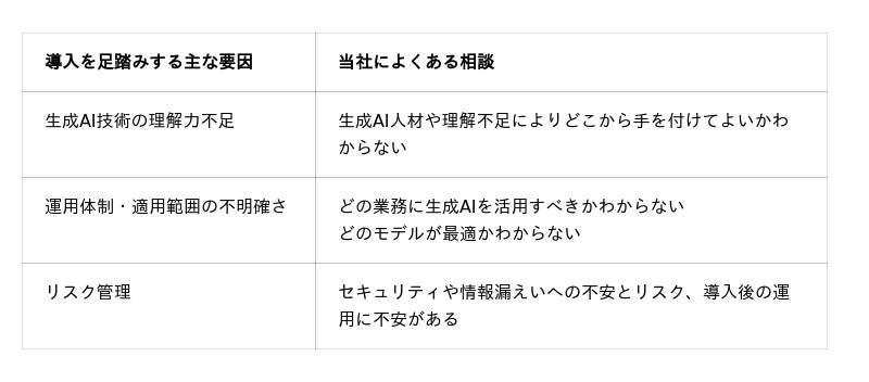 少子高齢化による人手不足や業務の高度化を背景に、企業における生成AI活用への期待が急速に高まっています。一方で現場では、情報漏えいや誤情報生成への不安といったガバナンス面の課題、使いこなすための人材・ノウハウ不足、さらに投資対効果(ROI)が見えにくく全社展開に踏み切れないといった壁が顕在化しています。