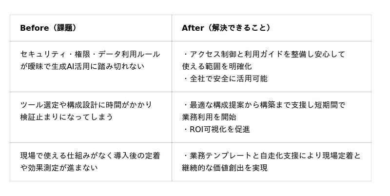 このサービスは当社で実際に導入・利活用段階を経て開発されたもので、実践知に基づく独自の生成AI活用のノウハウにより、生成AI環境の構築だけにとどまらず活用の定着まで支援します。