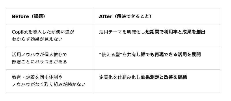 Copilot(※)活用が進まない企業に向けて、3つの柱(プロジェクト運営支援、伴走支援、プロンプトジェネレーター)をベースに、“AI技術者”が伴走し立ち上げから定着化施策までサポートします。生成AI活用の定着が進むことで、時間創出から価値創出への業務シフトを目指します。