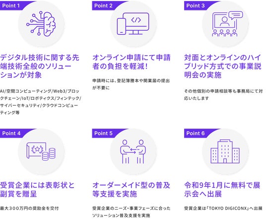 東京都(以下、「都」という。)は、都内中小企業等が有する、AI/XR/メタバース等に代表されるデジタル技術に関する先端技術を活用したソリューション等を表彰するとともに、事業連携先のマッチング支援等を行うことで、その普及を後押しし、都が抱える社会課題解決の加速化を図ることを目的とする「先端技術を活用した社会課題解決促進事業」を令和6年度から実施しています。