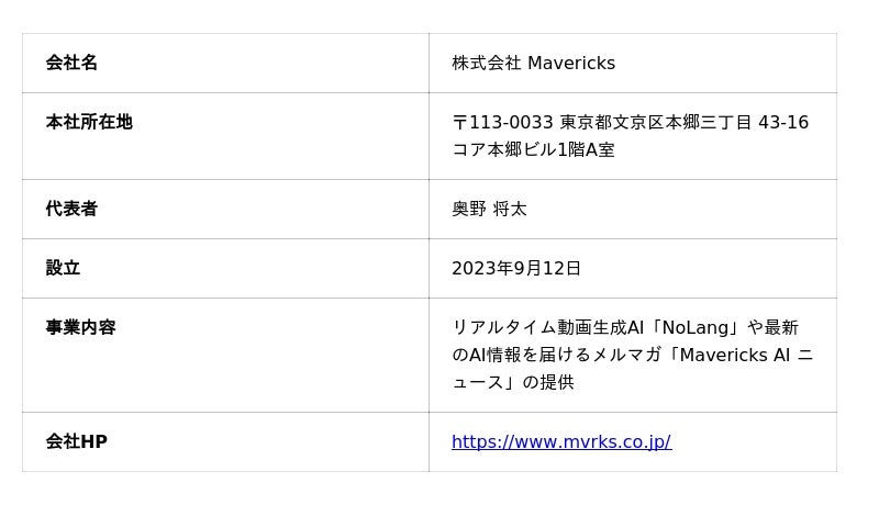 株式会社Mavericksは、プロダクトアウト型の生成AIスタートアップです。リアルタイム動画生成AI「NoLang」や超解像化技術「カクダイ」など、先端的な自社プロダクトを多数保有しています。生成AI時代の開発現場の先端をキャッチアップしている、開発力に特化したチームです。