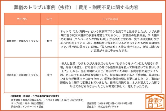 こうした背景を踏まえディライトは、葬儀でトラブルを経験した人を対象に調査を行い、実際の事例を公開しました。