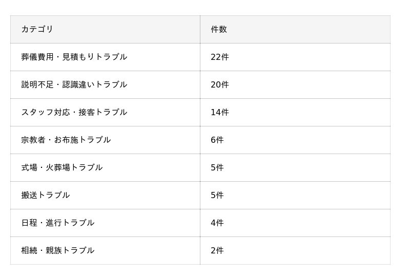 最も多かったのは「葬儀費用・見積もりに関するトラブル」で22件。全体の約28%を占めました。「見積もりより大幅に高い金額を請求された」「追加費用の説明がなかった」など、金銭面での認識の食い違いが目立ちます。
